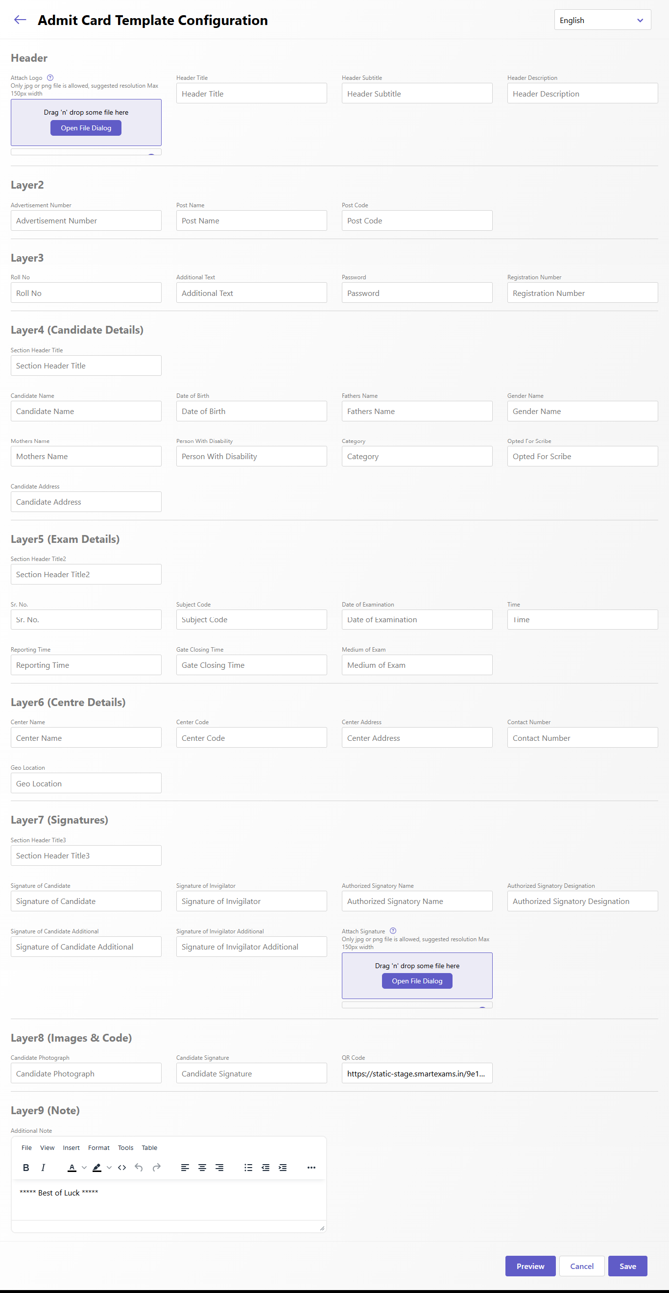 5. After Upload the template, click on Setting Icon, then "Admit Card template Configuration" Page , then you can add the Admit Configuration details such as Logo, Roll number, Header title, Candidate Details as so on.