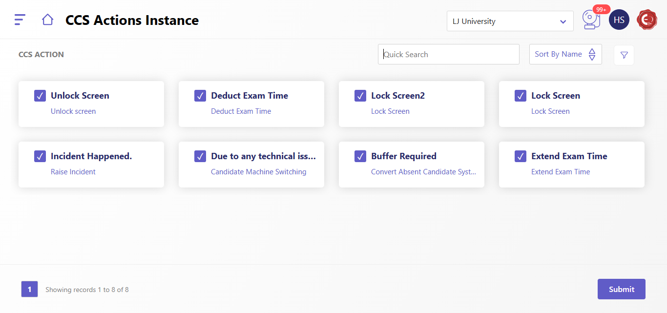 The CCS Actions Instance interface allows administrators to manage exam-related actions efficiently. It provides predefined options like unlocking/locking screens, extending/deducting exam time, handling incidents, and addressing technical issues. Users can search, sort, select actions via checkboxes, and submit for execution, ensuring smooth and controlled exam operations.