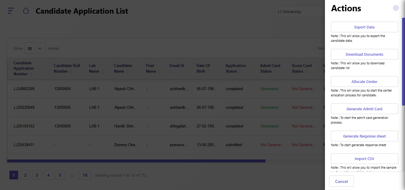 - The Candidate Application List allows administrators to view and manage candidate information. This includes key details such as application status, payment status, admit card generation, and more. The right-side "Actions" panel provides options to perform various tasks.
