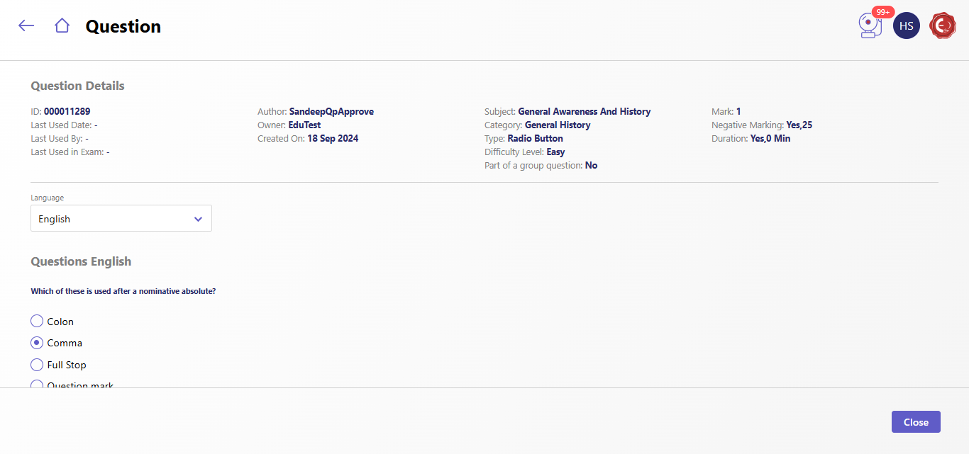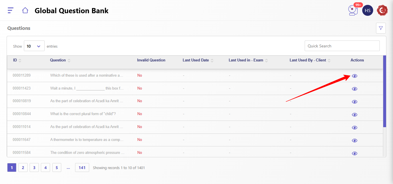 - Click the Eye Icon under the Actions column to open a detailed view of the selected question. The detailed view displays metadata (author, subject, category, etc.), scoring information, and the full question text with answer options.