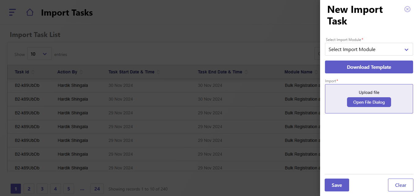 - The screen will display the Import Task List, showing previously created import tasks along with the following details: