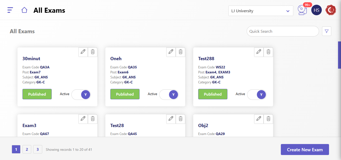- Quick Search: Filters exams based on keywords.