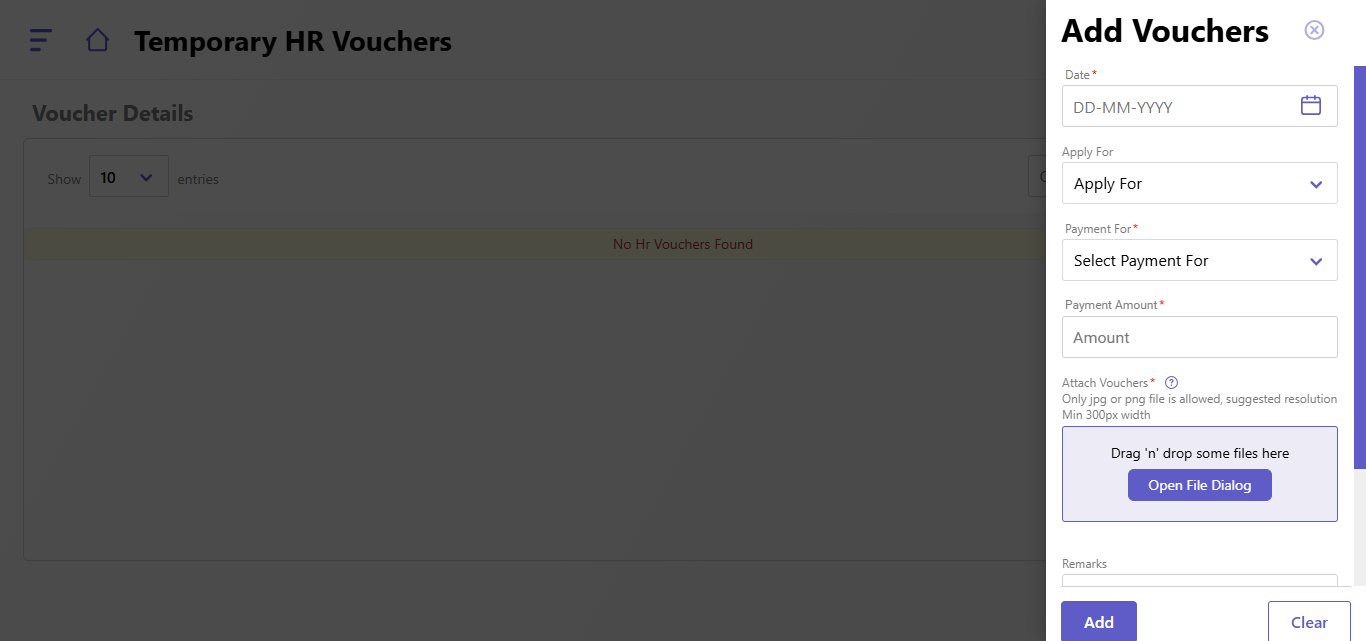 - Attach Vouchers: Drag and drop files or use the "Open File Dialog" button to upload vouchers (only .jpg or .png files are allowed with a suggested resolution of at least 300px width).